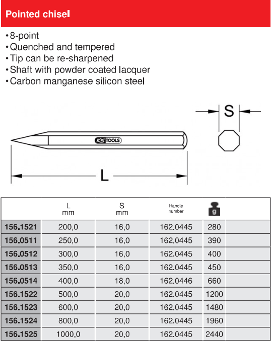 - Đục nhọn KS Tools 156.0511, KS Tools Pointed Chisel 156.0511 có tiết diện đục: Ø 16 mm, chiều dài tổng thể: 250 mm, chuyên dùng để đục phá trong công nghiệp.