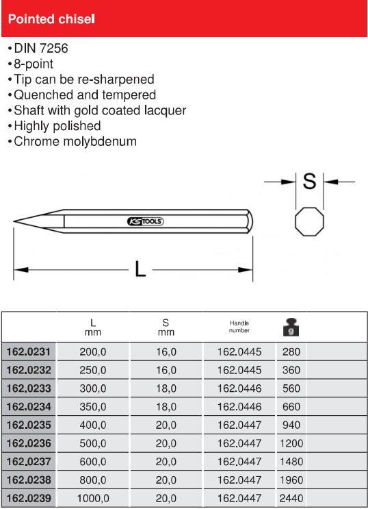 - Đục nhọn KS Tools 162.0235 được chế tạo bằng phương pháp rèn từ thép dụng cụ theo tiêu chuẩn DIN 7256.