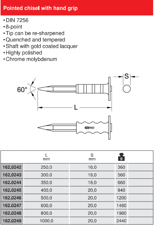 - Đục nhọn KS Tools 162.0244, KS Tools Pointed Chisel 162.0244 có tiết diện đục: Ø 18 mm, chiều dài tổng thể: 350 mm, chuyên dùng để đục phá trong công nghiệp.