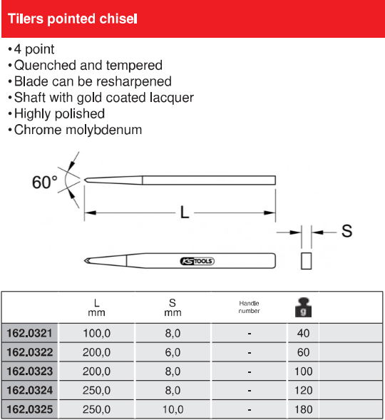 - Đục nhọn KS Tools 162.0325, KS Tools Cross Chisel 162.0325 có bề rộng đục: 10 mm, chiều dài tổng thể: 250 mm, chuyên dùng để đục phá trong công nghiệp.