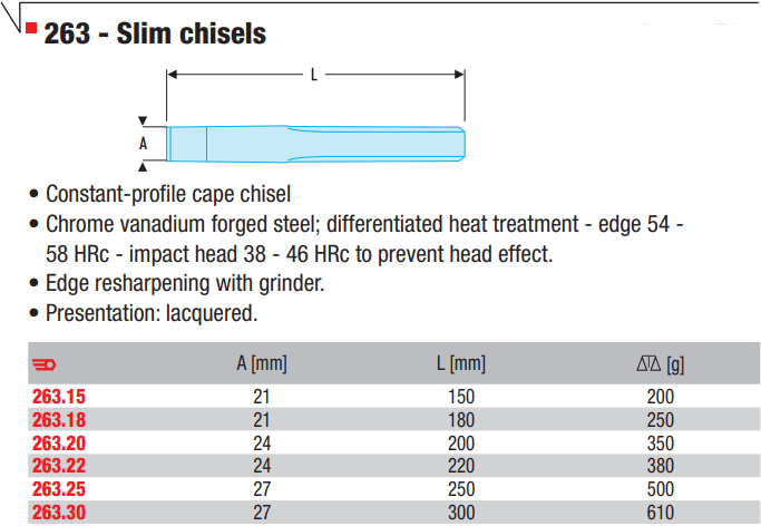 - Đục phẳng Facom 263.22 được chế tạo bằng phương pháp rèn từ thép dụng cụ (Chrome vanadi) xử lý nhiệt ở đầu đục cho độ cứng cao khi sử dụng (54 - 58 HRC).
