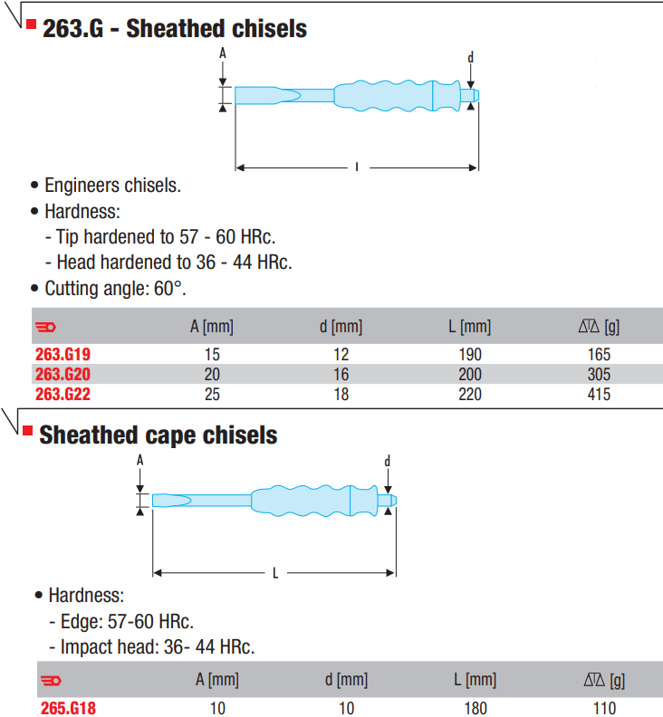 - Đục phẳng Facom được chế tạo bằng phương pháp rèn từ thép dụng cụ (Chrome vanadi) xử lý nhiệt ở đầu đục cho độ cứng cao khi sử dụng (57 - 60 HRC).