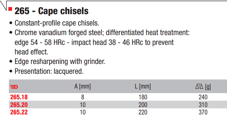 - Đục phẳng Facom 265.20 được chế tạo bằng phương pháp rèn từ thép dụng cụ (Chrome vanadi) xử lý nhiệt ở đầu đục cho độ cứng cao khi sử dụng (54 - 58 HRC).