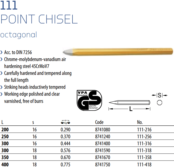 - Đục phẳng Gedore 111-358 được chế tạo bằng phương pháp rèn từ thép dụng cụ (Chrome vanadi) theo tiêu chuẩn DIN 7256.