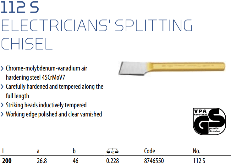 - Đục phẳng Gedore 112 S, Gedore Flat Chisel 112 S có bề rộng đục: 26.8 mm, đường kính chuôi: 46 mm, chiều dài tổng thể: 200 mm, chuyên dùng để đục phá các chi tiết trong công nghiệp.