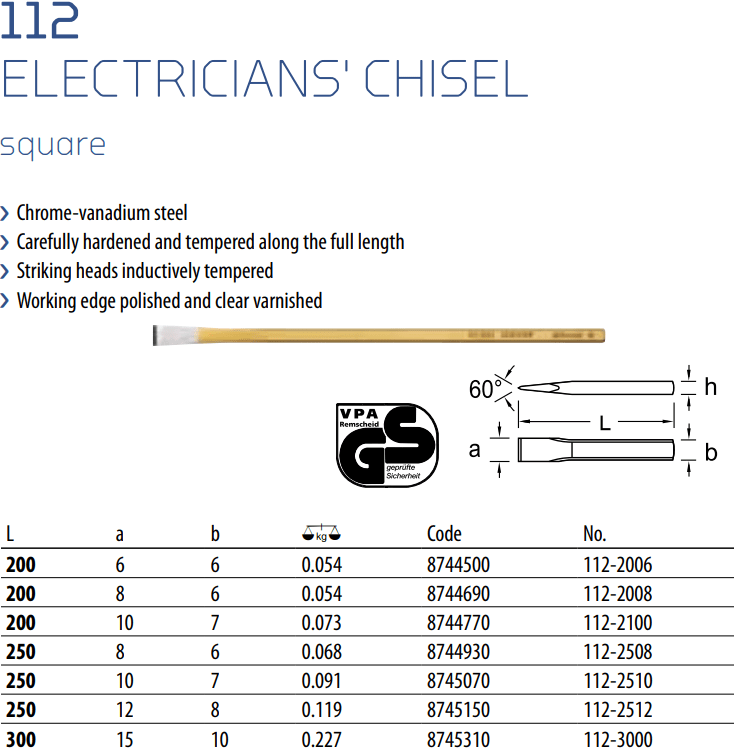 - Đục phẳng Gedore 112-2508 được chế tạo bằng phương pháp rèn từ thép dụng cụ (Chrome vanadi).