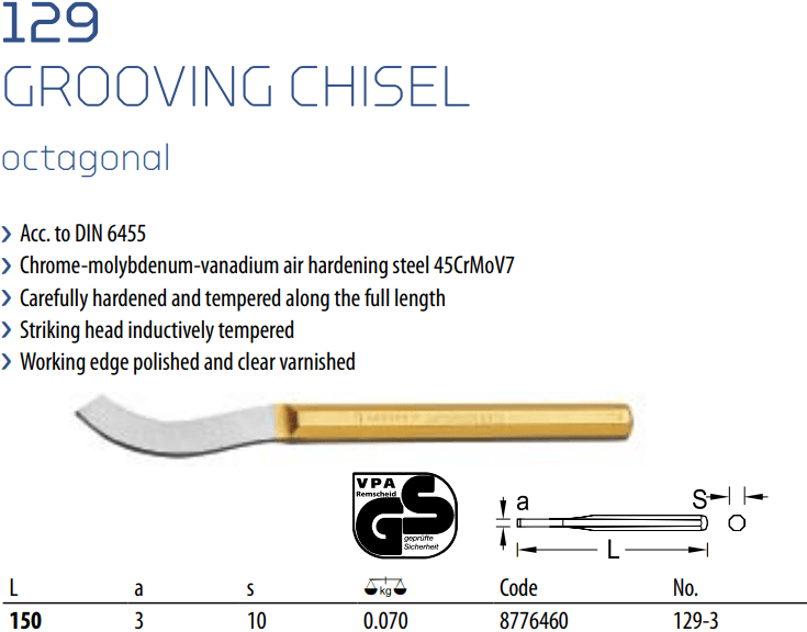 - Đục phẳng Gedore 129-3 được chế tạo bằng phương pháp rèn từ thép dụng cụ (Chrome vanadi) theo tiêu chuẩn DIN 6451.