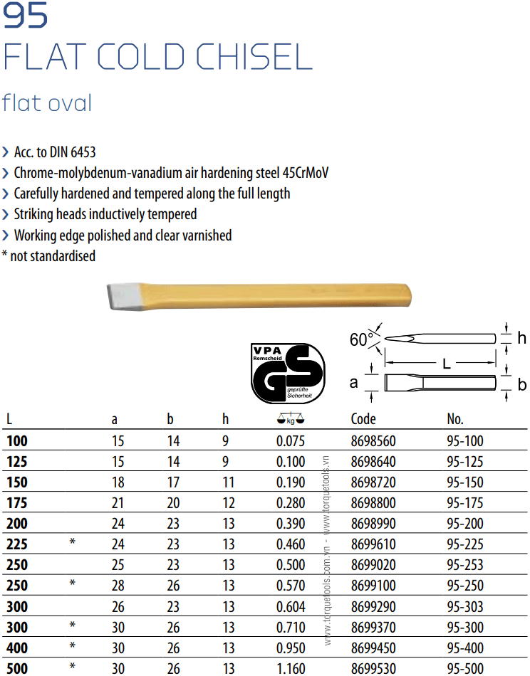 - Đục phẳng Gedore 95-200 được chế tạo bằng phương pháp rèn từ thép dụng cụ (Chrome vanadi).