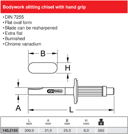 - Đục phẳng KS Tools 140.2165, KS Tools Flat Chisel 140.2165 có bề rộng đục: 21 mm, chiều dài tổng thể: 300 mm, chuyên dùng để đục phá trong công nghiệp.