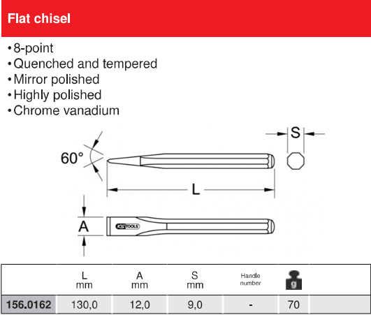 - Đục phẳng KS Tools 156.0162, KS Tools Flat Chisel 156.0162 có bề rộng đục: 12 mm, đường kính chuôi: 9 mm, chiều dài tổng thể: 130 mm, chuyên dùng để đục phá trong công nghiệp.