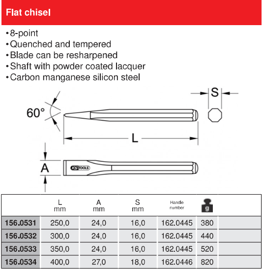 - Đục phẳng KS Tools 156.0533 được chế tạo bằng phương pháp rèn từ thép dụng cụ.