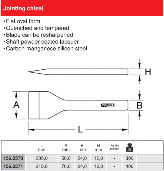 - Đục phẳng KS Tools 156.0571, KS Tools Flat Chisel 156.0571 có bề rộng đục: 70 mm, bề dày chuôi: 12 mm, chiều dài tổng thể: 215 mm, chuyên dùng để đục phá trong công nghiệp.