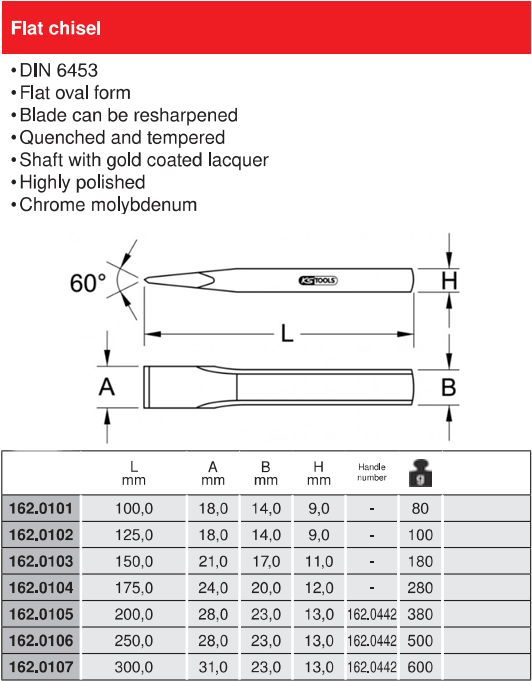 - Đục phẳng KS Tools 162.0107 được chế tạo bằng phương pháp rèn từ thép dụng cụ.