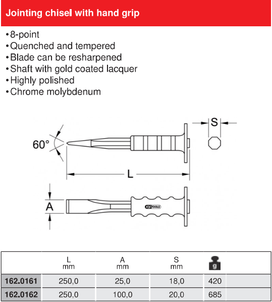 - Đục phẳng KS Tools 162.0162, KS Tools Flat Chisel 162.0162 có bề rộng đục: 100 mm, đường kính chuôi: 20 mm, chiều dài tổng thể: 250 mm, chuyên dùng để đục phá trong công nghiệp.