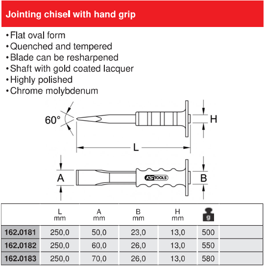 - Đục phẳng KS Tools 162.0181, KS Tools Flat Chisel 162.0181 có bề rộng đục: 50 mm, chiều dài tổng thể: 250 mm, chuyên dùng để đục phá trong công nghiệp.