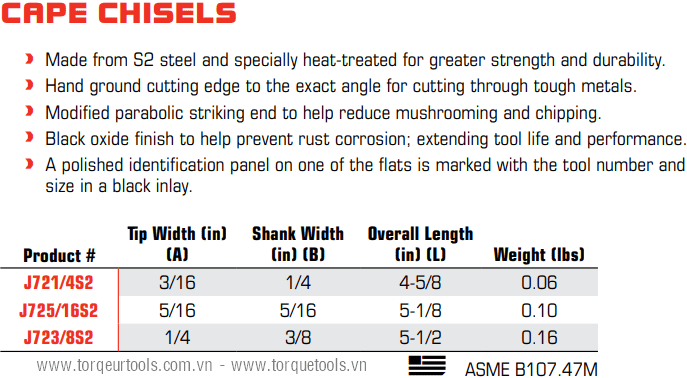 - Đục phẳng Proto J723/8S2 được chế tạo bằng phương pháp rèn từ thép dụng cụ (mạ kẽm toàn thân) tạo độ cứng hạng chế sức mẻ khi sử dụng.