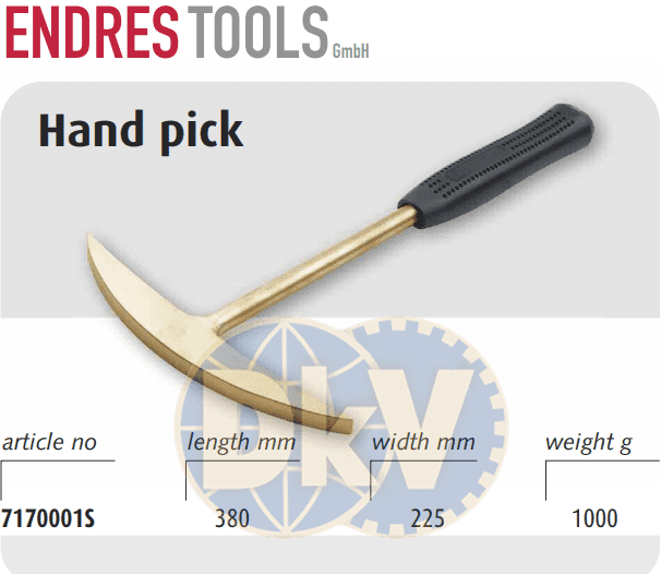 - Cuốc chống cháy nổ Endres 7170001S, Endres non sparking hand picks 7170001S có bề mặt đục: Ø 225 mm, chiều dài tổng thể 380 mm, chuyên dùng trong môi trường yêu cầu tính phòng chống cháy nổ.