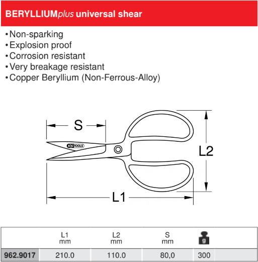 - Kéo cắt chống tia lửa điện KS Tools 962.9017 được chế tạo bởi hợp kim đồng/beri (Cu Be) hoặc hợp kim đồng/nhôm ( Br Al), có tác dụng không gây đánh lửa khi xảy ra va chạm, phù hợp trong môi trường phòng chống cháy nổ.