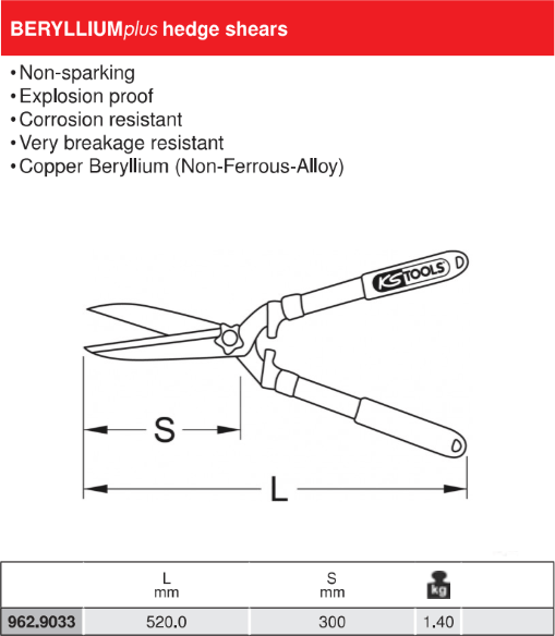 - Kéo cắt chống tia lửa điện KS Tools 962.9033 được chế tạo bởi hợp kim đồng/beri (Cu Be) hoặc hợp kim đồng/nhôm ( Br Al), có tác dụng không gây đánh lửa khi xảy ra va chạm, phù hợp trong môi trường phòng chống cháy nổ.