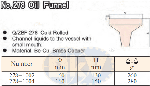 - Phễu chống cháy nổ X-Spark 278-1004, X-Spark non sparking oil funnel 278-1004 có chiều dài miệng: 160 mm, chiều cao tổng thể: 150 mm, chuyên dùng trong môi trường yêu cầu tính phòng chống cháy nổ.