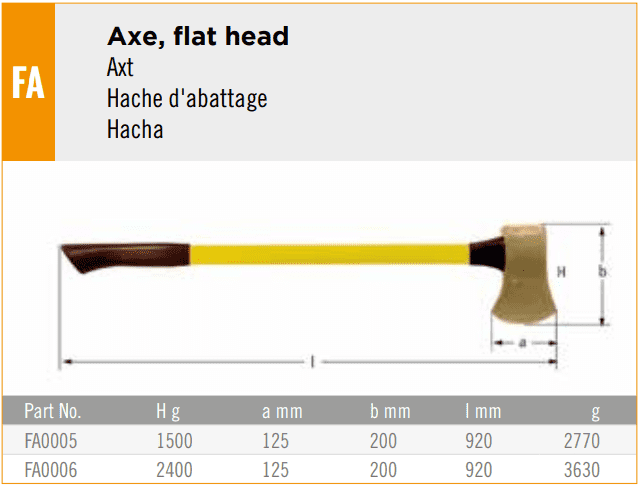 - Rìu chống cháy nổ Ampco FA0006, Ampco non sparking flat head axe FA0006 có chiều dài miệng: Ø 125 mm, chiều dài tổng thể 920 mm, chuyên dùng trong môi trường yêu cầu tính phòng chống cháy nổ.