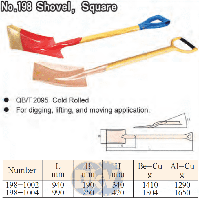- Xẻng chống cháy nổ X-Spark 198-1002 được chế tạo bằng hợp kim đồng/bery (Cu Be) hoặc đồng/nhôm (Br Al), tuyệt đối không phát tia lửa khi va chạm.