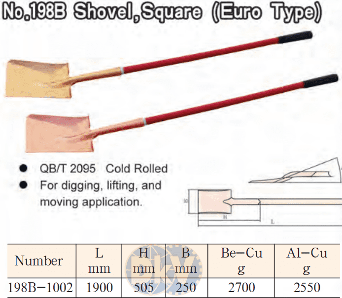 - Xẻng chống cháy nổ X-Spark 198B-1002 được chế tạo bằng hợp kim đồng/bery (Cu Be) hoặc đồng/nhôm (Br Al), tuyệt đối không phát tia lửa khi va chạm.