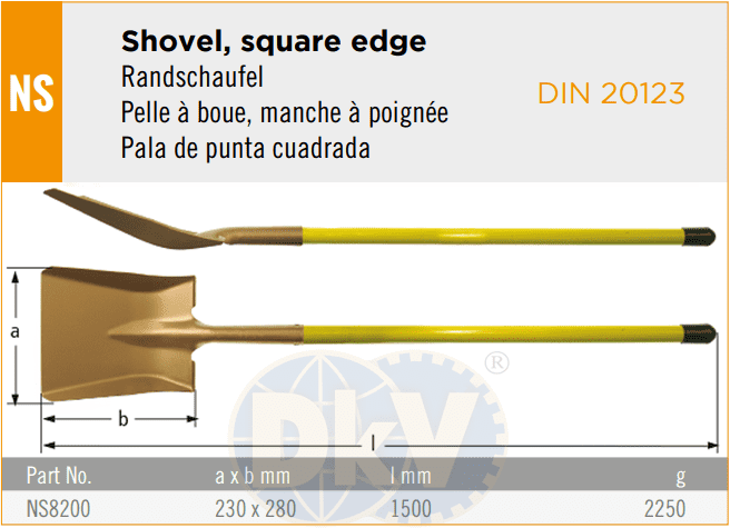 - Xẻng chống cháy nổ Ampco NS8200, Ampco edging spade with T-handle NS8200 có bề mặt đục: Ø 230x280 mm, chiều dài tổng thể 1500 mm, chuyên dùng trong môi trường yêu cầu tính phòng chống cháy nổ.