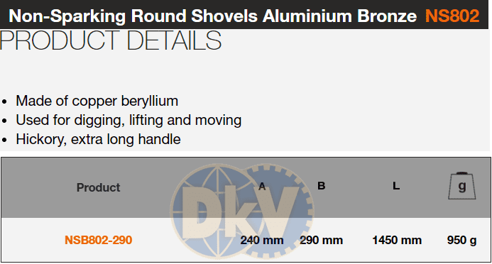 - Xẻng chống cháy nổ Bahco NSB-802-290 được chế tạo bằng hợp kim đồng/bery (Cu Be) hoặc đồng/nhôm (Br Al), tuyệt đối không phát tia lửa khi va chạm.