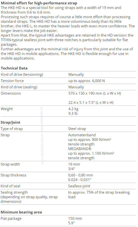 - Dụng cụ đóng đai Titan HKE-HD, Titan Combined strapping tool HKE-HD chuyên dùng để đóng dây đai thép với lực căng < 6.000 N (6 kN), sử dụng cho đai thép 19 mm (3/4"), chuyên dùng để đóng đai thép cho các kiện hàng nặng cần chằng buộc.
