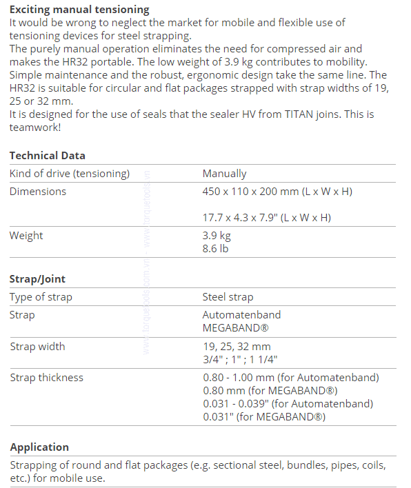 - Dụng cụ đóng đai Titan HR 32, Titan Combined strapping tool HR 32 chuyên dùng để đóng dây đai thép 19 mm (3/4"), 25 mm (1"), 32 mm (1.1/4'') cho các kiện hàng nặng cần chằng buộc.