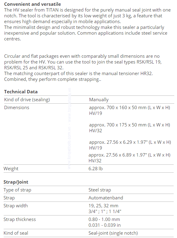 - Dụng cụ đóng đai Titan HV, Titan Combined strapping tool HV chuyên dùng để đóng dây đai thép 19 mm (3/4"), 25 mm (1"), 32 mm (1.1/4'') cho các kiện hàng nặng cần chằng buộc.