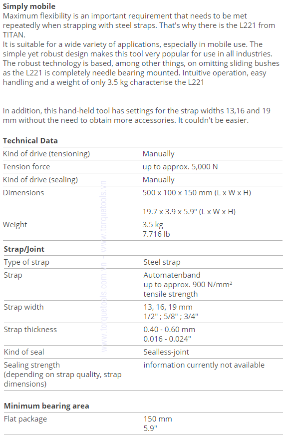 - Dụng cụ đóng đai Titan L221, Titan Combined strapping tool L221 chuyên dùng để đóng dây đai thép với lực căng < 5.000 N (5 kN), sử dụng cho đai thép 13 mm(1/2'), 16 mm (5/8") và 19 mm (3/4"), chuyên dùng để đóng đai thép cho các kiện hàng nặng cần chằng buộc.