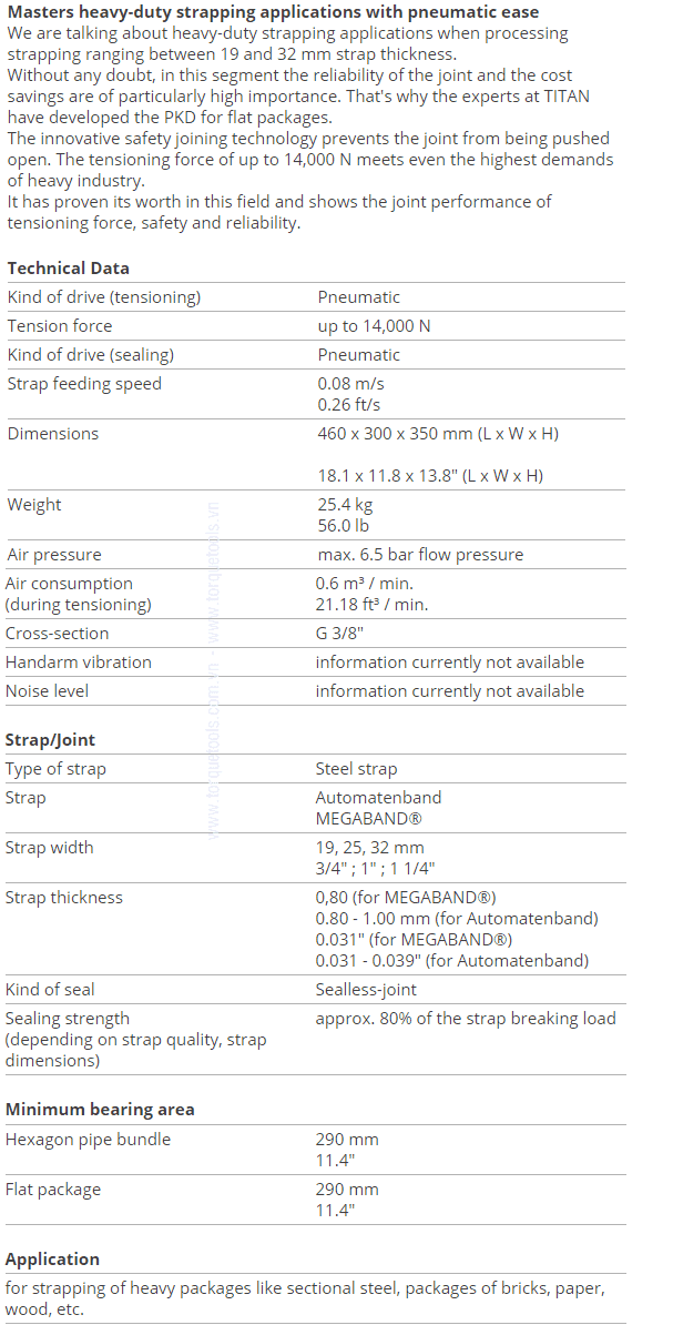- Dụng cụ đóng đai Titan PKD, Titan Combined strapping tool PKD chuyên dùng để đóng dây đai thép với lực căng < 14.000 N (14 kN), sử dụng cho đai thép 19 mm (3/4''), 25 mm (1") và 32 mm (1.1/4"), chuyên dùng để đóng đai thép cho các kiện hàng nặng cần chằng buộc.