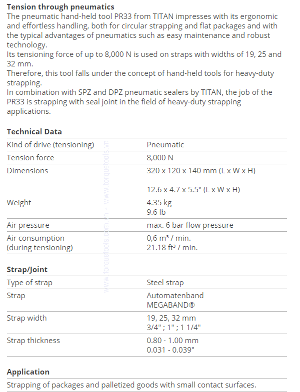 - Dụng cụ đóng đai Titan PR 33, Titan Combined strapping tool PR 33 chuyên dùng để đóng dây đai thép với lực căng < 8.000 N (20 kN), sử dụng cho đai thép 19 mm (3/4"), 25 mm (1"), 32 mm (1.1/4") chuyên dùng để đóng đai thép cho các kiện hàng nặng cần chằng buộc.