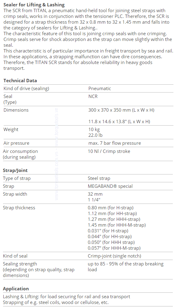 - Dụng cụ đóng đai Titan SCR, Titan Combined strapping tool SCR chuyên dùng để đóng dây đai thép 32 mm (1.1/4'') cho các kiện hàng nặng cần chằng buộc.