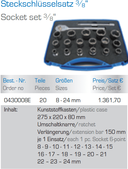 Bộ khẩu Inox A-Mag 0430008E, A-MAG inox socket set 0430008E là hộp dụng cụ 20 chi tiết, size khẩu đầu vào 3/8", chuyên dùng để siết/vặn bulong, đai ốc, vít trong công nghiệp.Các chi tiết trong bộ khẩu Inox A-Mag 0430008E gồm: