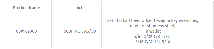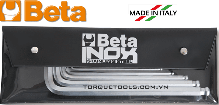 - Bộ khóa lục giác Inox 96BPINOX-AS/B8, Beta inox hexagon allen key 96BPINOX-AS/B8: là bộ khóa lục giác gồm: 8 chi tiết (5/64-3/32-1/8-5/32-3/16-7/32-1/4-5/16") dùng trong môi trường có từ tính cao.