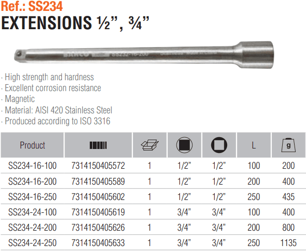- Khẩu nối dài Inox Bahco SS234-24-200, Bahco Inox extension SS234-24-200 có đầu vào: 3/4", chiều dài: 200 mm, chuyên dùng để nối các tay công trong môi trường có từ tính cao còn được sử dụng để tránh mọi nhiễu loạn từ tính, chẳng hạn như các thiết bị điện tử...v.v