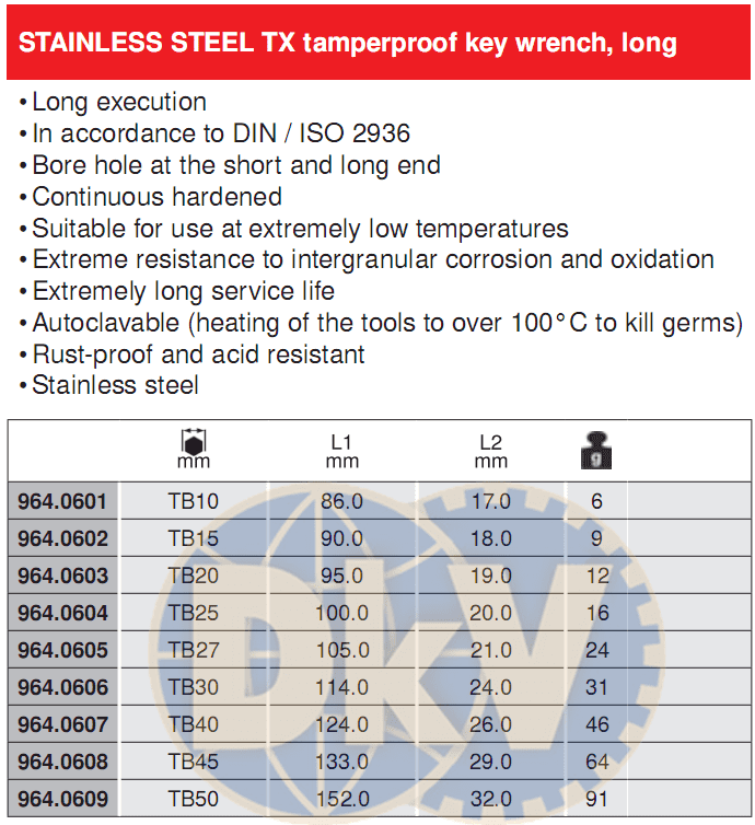 - Khóa lục giác Inox KS Tools 964.0602, KS Tools inox Torx tamperproof key wrench 964.0602 là loại đầu torx, có size: TB15, chiều dài: 90 mm, dùng trong môi trường có từ tính cao.