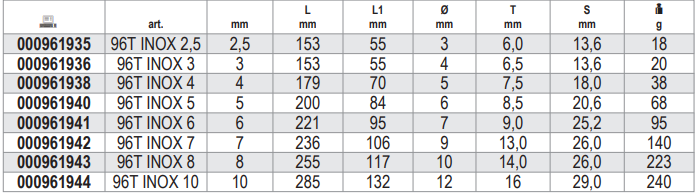 - Lục giác chữ T Beta 96T INOX 3 có trọng lượng: 18 g.