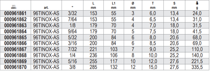 - Lục giác chữ T Beta 96TINOX-AS 7/64 được chế tạo bởi thép không gỉ, có khả năng chống ăn mòn và oxy hóa, tuổi thọ cao, có khả năng chịu lực va đập, xoắn vặn tốt, hạn chế sứt mẻ.