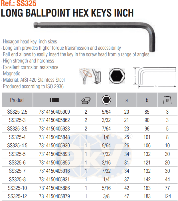 - Khóa lục giác Inox Bahco SS325-2.5, Bahco inox hexagon allen key SS325-2.5 chuyên siết các bulong, vít chìm lục giác: 5/64", chiều dài: 85 mm, dùng trong môi trường có từ tính cao, Chẳng hạn như các thiết bị điện tử ...v.v. Khóa lục giác Inox Bahco SS325-2.5 còn được sử dụng ở môi trường rất nhạy cảm như phòng thí nghiệm, bệnh viện, nhà máy điện, v.v.