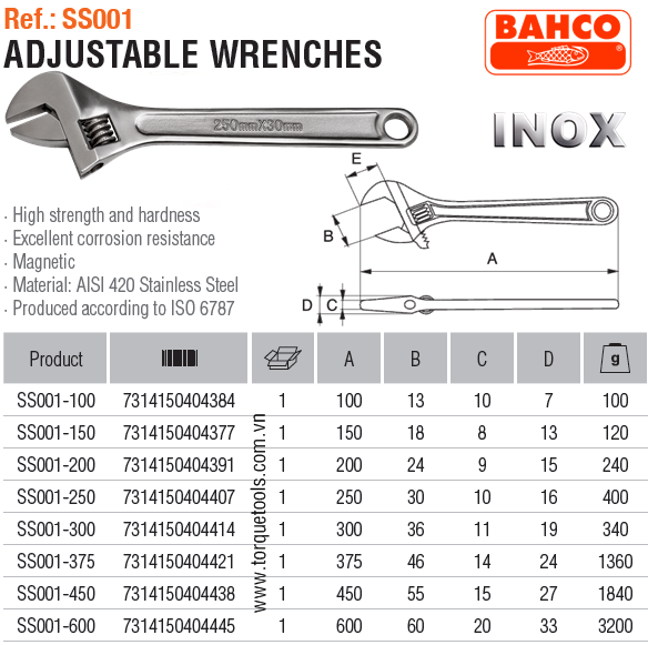 - Mỏ lết Inox Bahco SS001-100, Bahco stainless steel adjustable wrench SS001-100 có tính kháng từ, với nhiều ứng dụng: siết bulong, đai ốc...trong môi trường có từ tính cao. Mỏ lết Inox Bahco SS001-100 có độ mở max: 13 mm, chiều dài: 100 mm.
