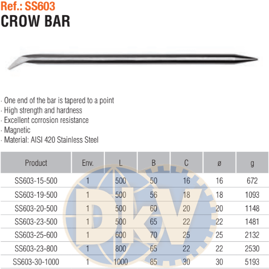 - Xà beng Inox Bahco SS603-23-500 được chế tạo bởi thép không gỉ ( Stainless Steel AISI 420) có khả năng chống ăn mòn và oxy hóa, tuổi thọ cao. Xà beng Inox Bahco SS603-23-500 được xử lý nhiệt độ cao (>100oC) cho khả năng chịu lực cao hạn chế sứt mẻ khi nại các chi tiết.