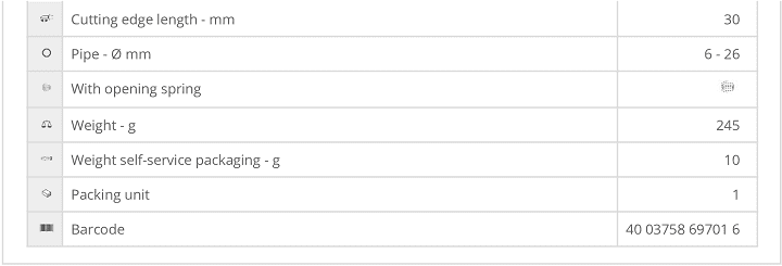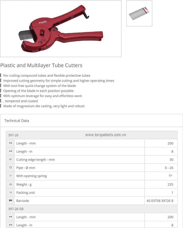 - Cắt ống NWS 397-26-SB, NWS pipe cutters 397-26-SB: có đường kính: Ø 6 - 26 mm, sử dụng bánh (đĩa cắt) chuyên dùng để cắt các loại ống trong công nghiệp.