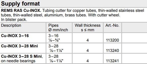 - Cắt ống Rems 113200, Rems pipe cutters 113200 có đường kính: Ø 3 - 16 mm, sử dụng bánh (đĩa cắt) chuyên dùng để cắt các loại ống trong công nghiệp.