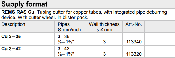 - Cắt ống Rems 113340, Rems pipe cutters 113340 có đường kính: Ø 3 - 35 mm, sử dụng bánh (đĩa cắt) chuyên dùng để cắt các loại ống trong công nghiệp.