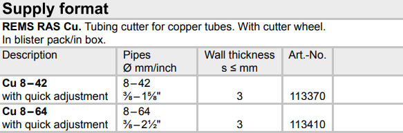 - Cắt ống Rems 113410, Rems pipe cutters 113410 có đường kính: Ø 8 - 64 mm, sử dụng bánh (đĩa cắt) chuyên dùng để cắt các loại ống trong công nghiệp.