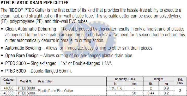- Cắt ống Ridgid 41608, Ridgid pipe cutter 41608 chuyên dùng để cắt các loại ống nhựa trong công nghiệp có đường kính: Ø1.1/4" - 1.1/2". Lưỡi cắt của cắt ống cắt ống Ridgid 41608 được chế tạo bằng thép dụng cụ có độ bền cao.
